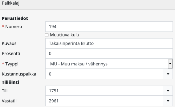 Perustetaan oma Palkkalaji Takaisinperinnälle (jos se puuttuu) Palkkalajityypillä MU - Muu vähennys/maksu.