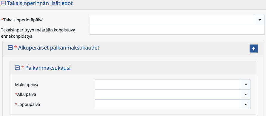 Lisäksi tulee täyttää Takaisinperinnän lisätiedot manuaalisesti: