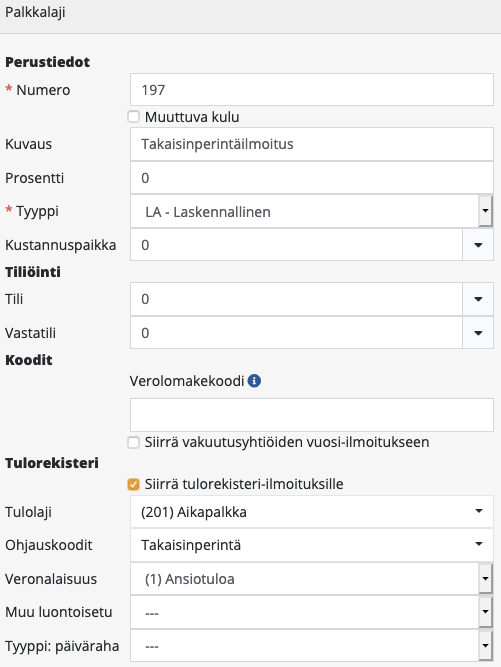 Tässä esimerkissä on perustettu Palkkalaji 197 'Takaisinperintäilmoitus', jolla on Palkkalajityyppinä LA - Laskennallinen, jonka Tulorekisteriasetukset ovat: