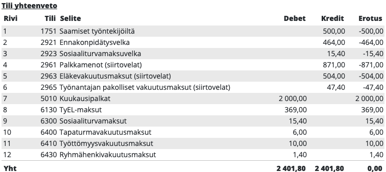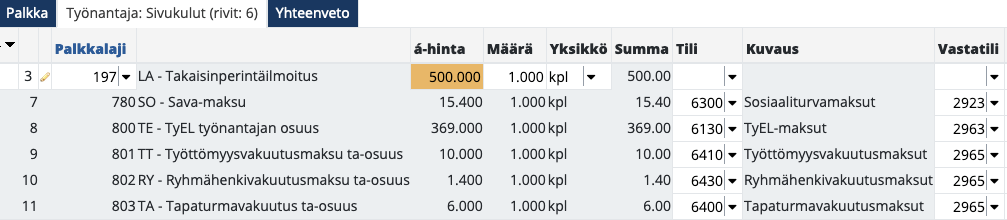 Tallennuksen jälkeen Takaisinperinnän bruttosummarivi siirtyy Työnantaja: Sivukulut -välilehdelle: