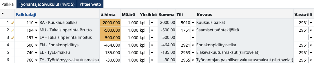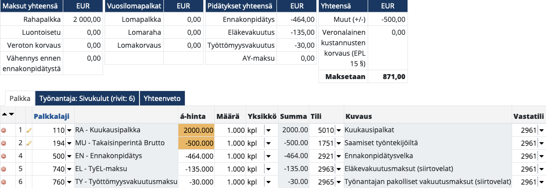 Palkkalaji lisätään Palkkalaskelman Palkkariveille, jolloin takaisinperintärivi pienentää Maksetaan summaa: