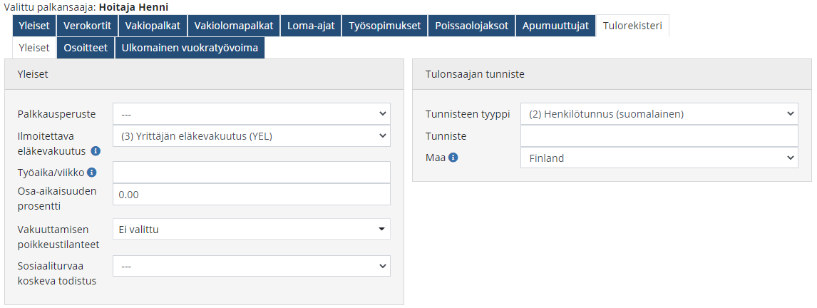 Tunniste-kenttään tuodaan palkansaajan Henkilötunnus palkansaajan Yleiset -välilehdeltä.