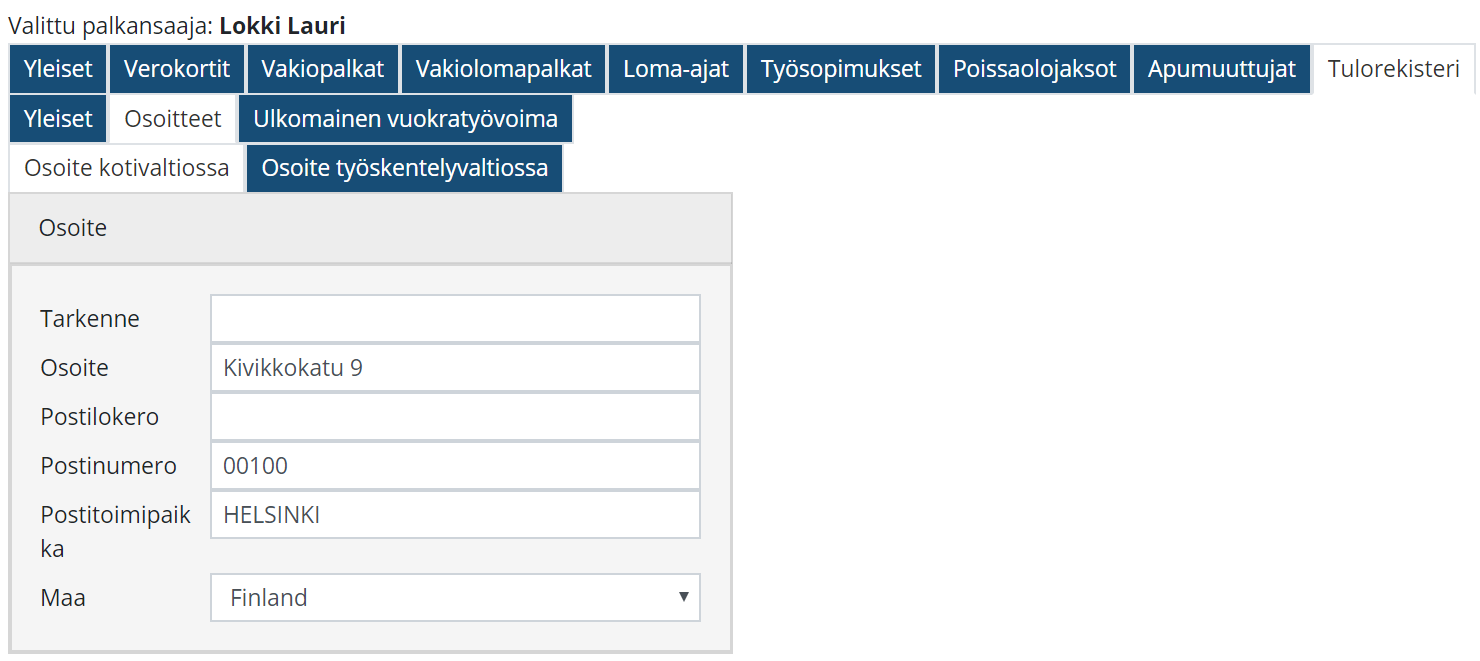 Palkkalaskelmalla käytetään palkansaajalla henkilörekisterissä olevaa osoitetta. Henkilörekisterissä oleva osoite tuodaan myös Osoite Kotivaltiossa -kohtaan.