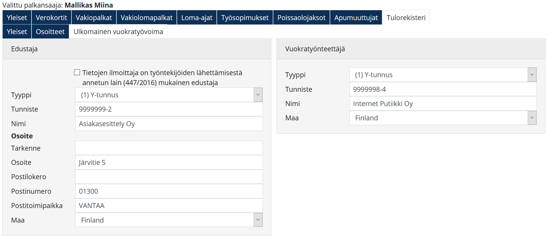 Ulkomaalaisen vuokratyövoiman osalta tiedot ylläpidetään Palkansaajan Tulorekisteri - Ulkomaalainen vuokratyövoima -välilehdellä.