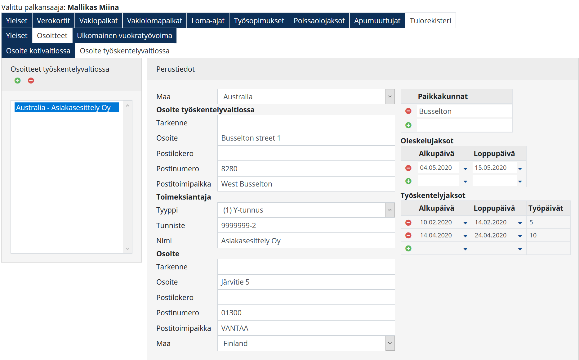 Osoitteet työskentelyvaltiossa -kohtaan voidaan tallentaa ulkomailla työskentelevän suomalaisen tai Suomessa työskentelevän ulkomaalaisen työskentelyn osalta työskentelyvaltion osoitetiedot sekä toimeksiantajan tiedot osoitetietoineen.
