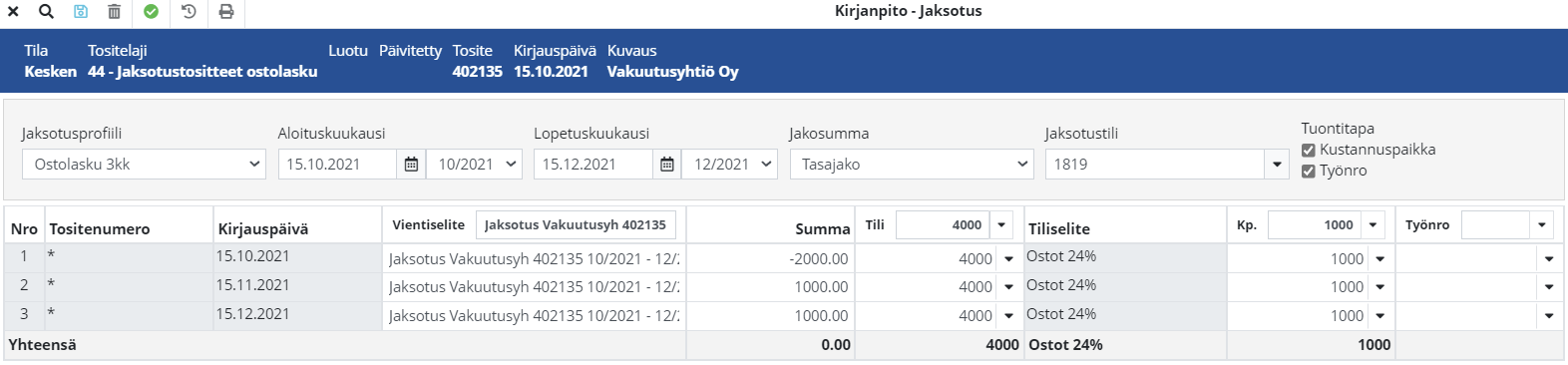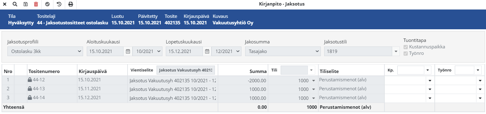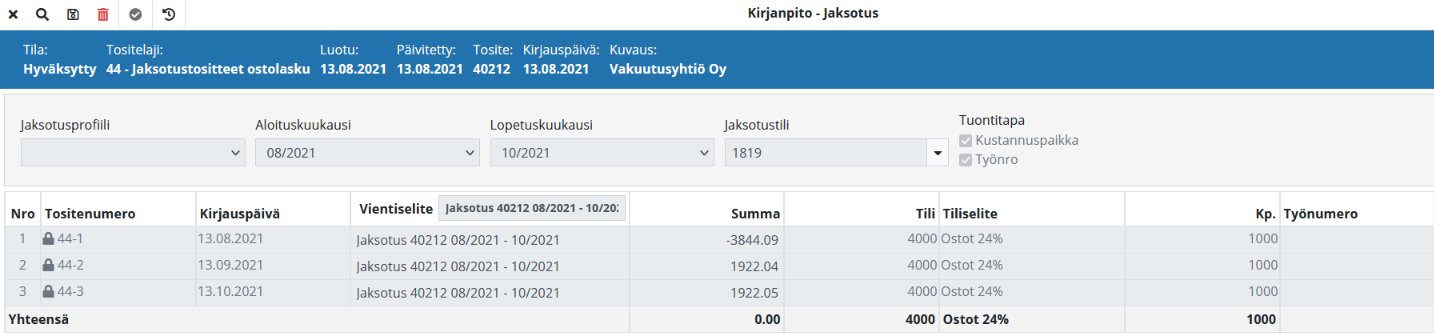 Jaksotuksien vientiselitteet muodostetaan automaattisesti asetuksien mukaisesti Asetukset > Talous > Kirjanpito > Asetukset-välilehti