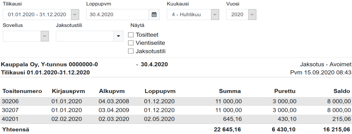 Raportti hakee jaksotuksesta löytyvät avoimet tositteet kirjauspäivämäärän mukaan käyttäen loppupäivää rajauksena.