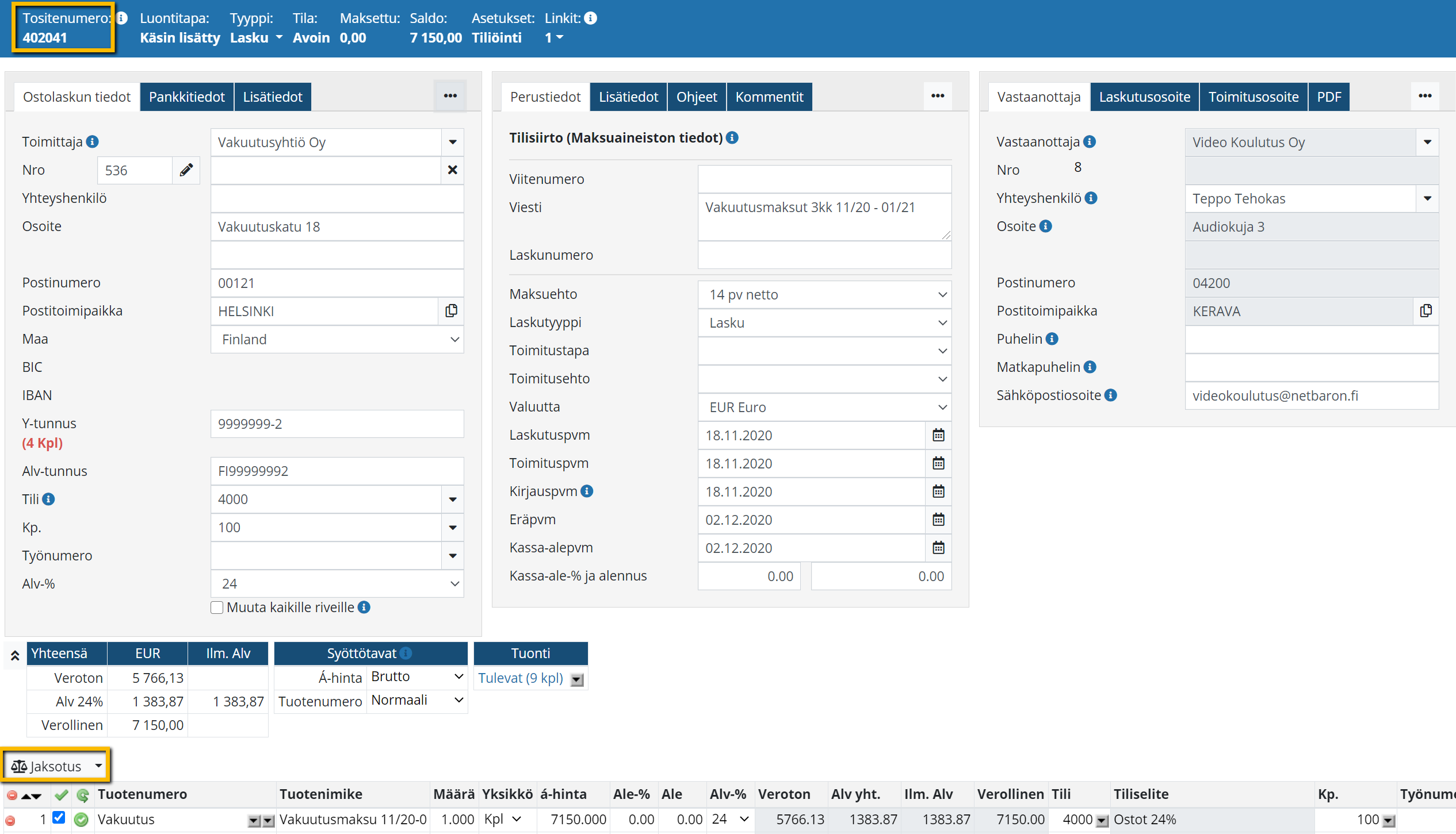 Laskulla tulee olla kirjauspäivä ja tuoterivi, jolla on veroton hinta, jonka jälkeen rivitietojen yläpuolelle tulee aktiiviseksi
