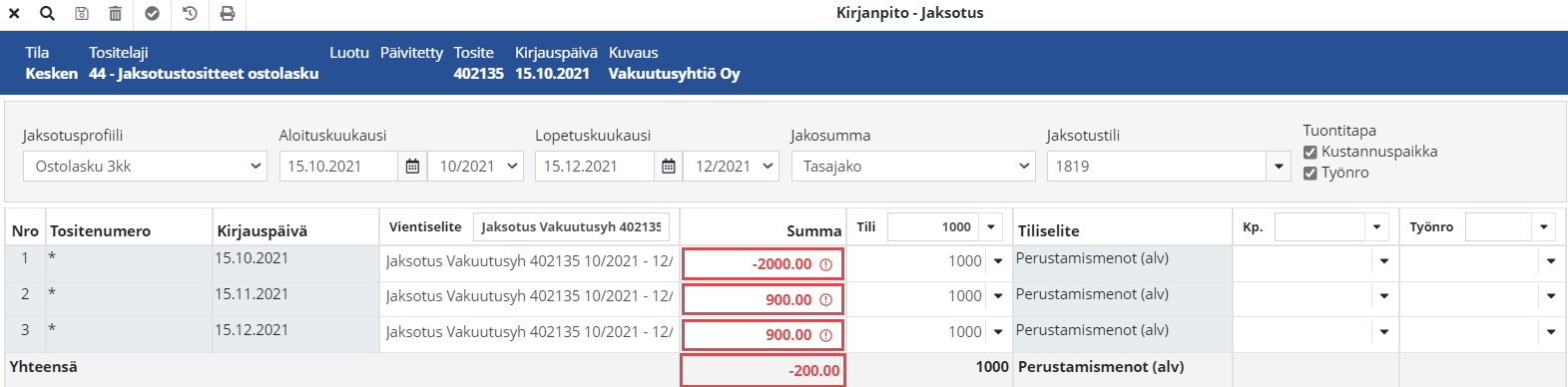 Summa Tositteen alkuperäinen summa jaksotukselle