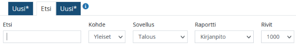 Raportteja pääsee valitsemaan Etsi-näkymässä, jossa voi määrittää mitä raportteja halutaan ajaa.
