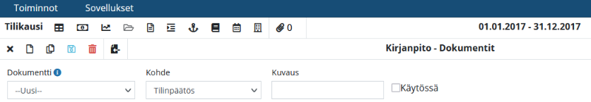 Liitetiedostoja voidaan tallentaa valittuun tilikauteen. Liitetiedosto voidaan lisätä napsauttamalla Liitetiedostot-painiketta.