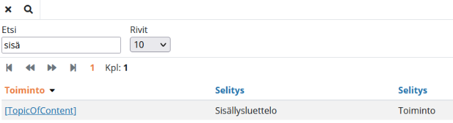 Valitaan avautuvasta Toiminto-ikkunasta kohta sisällysluettelo [TopicOfContent] kaksoisnapsauttamalla sitä. Kyseisen kohdan voi hakea kirjoittamalla Etsi-kenttään sanan tai sanan osan.
