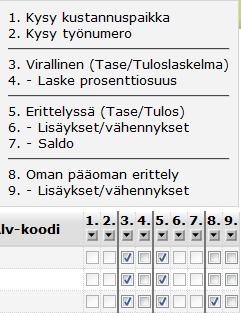 Erittelyssä - Lisäykset/poistot: tase-erittelyä varten oleva valinta, joka näkyy tilikartalla rivien valintaruutuna oikeassa laidassa. Kyseinen valinta on myös CSV-viennissä ja -tuonnissa.
