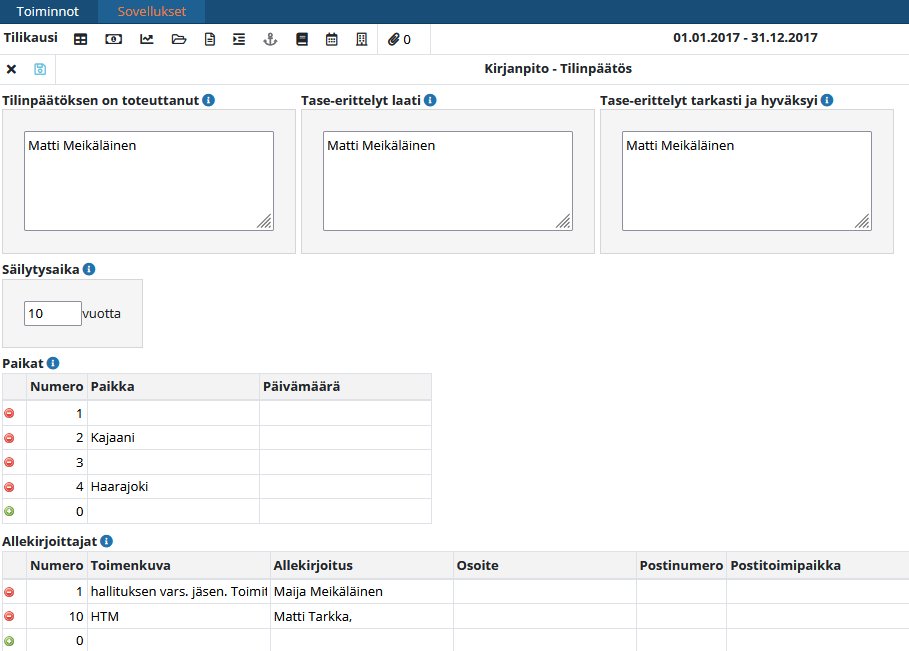 Tilinpäätöksen paikka ja allekirjoittajat toimivat oletuksena seuraavilla parametreilla: