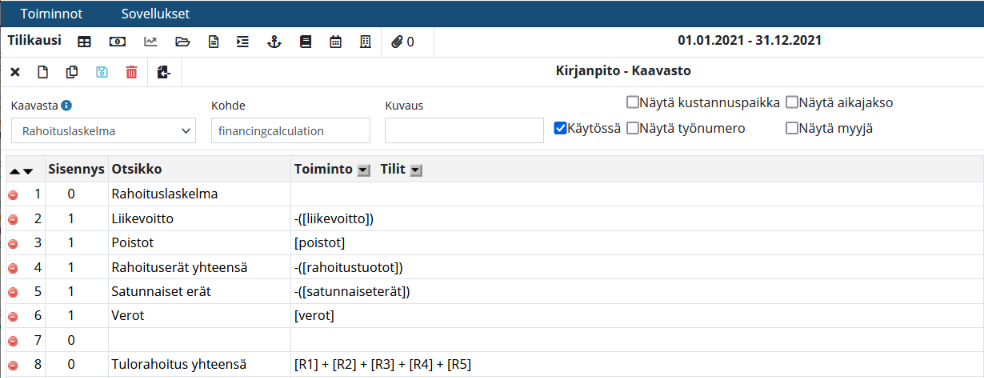 Mikäli kaavastossa on aktiivisena Käytössä-valinta, ajetaan käytössä oleva kaavasto tilikaudelta, jolloin kaavaston kohteena on owncapitalanalysis.