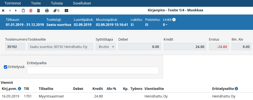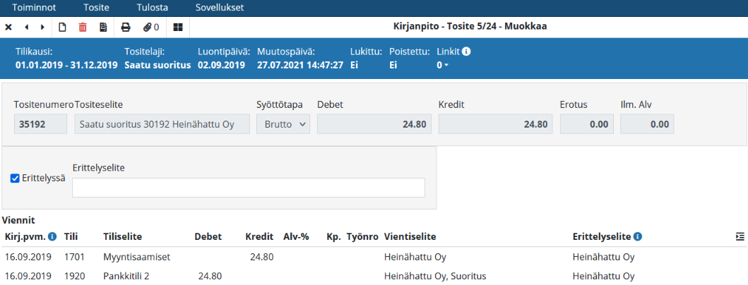 Erittelyssä: tilin tapahtumat menevät oletuksena vientitapahtumalle, mikäli tämä valinta on aktiivinen.