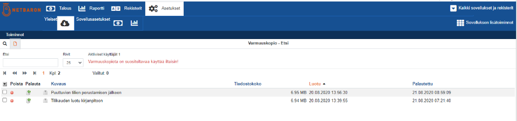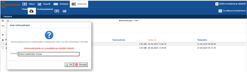 Huom! Netbaronin muut selainikkunat tulee sulkea, ennen varmuuskopion tekemistä.