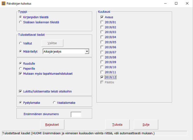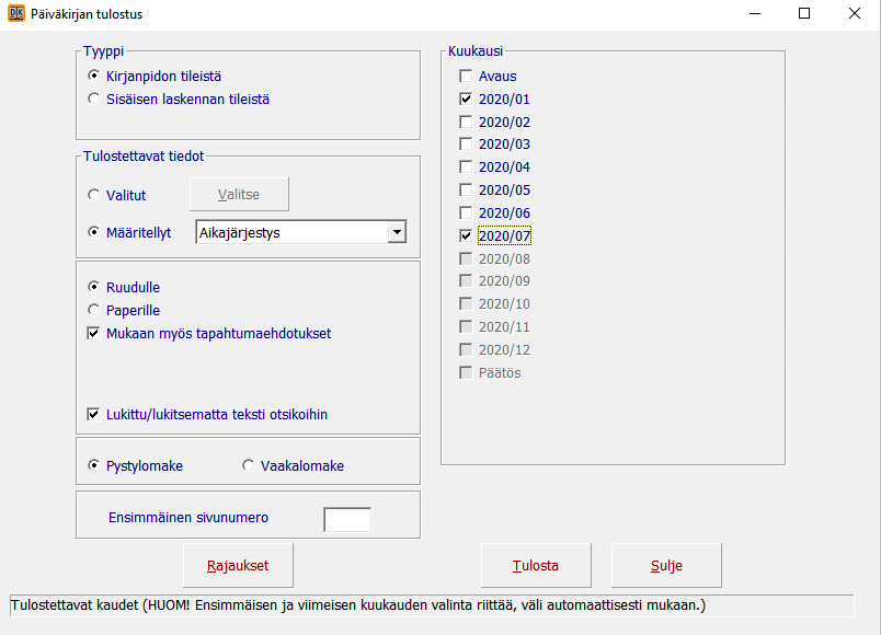 Tikonissa tulostetaan päiväkirja ruudulle koko tilikaudelta. Mukaan on otettava kuukausirajauksissa Avaus-valinta.