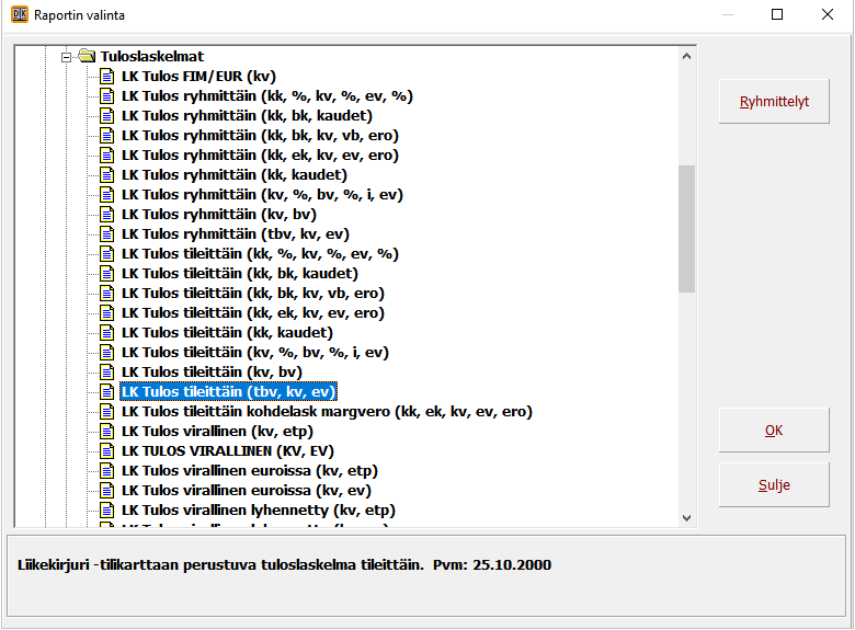 Valitaan LK Tulos tileittäin (tbv, kv, ev)