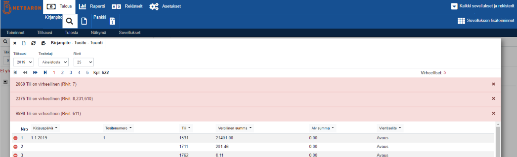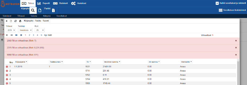Puuttuvat tilit tulee lisätä Netbaronin tilikarttaan.