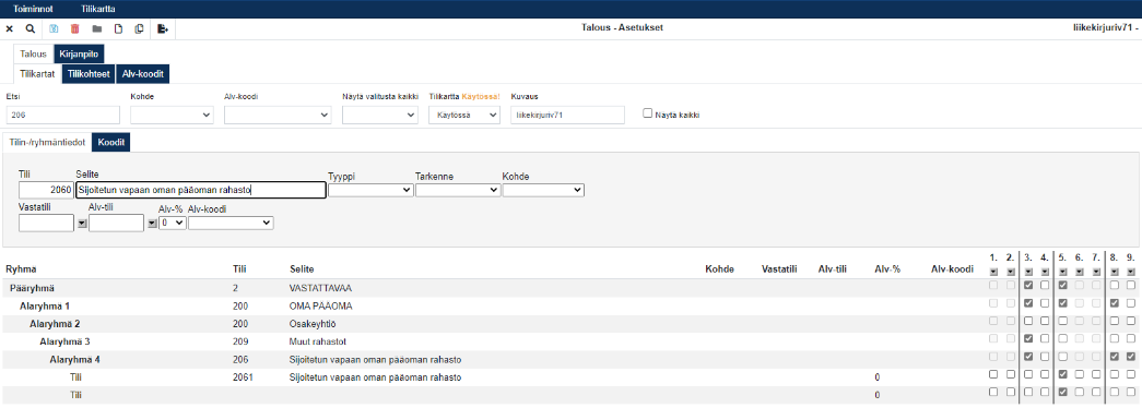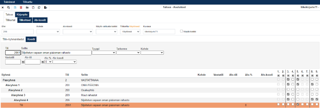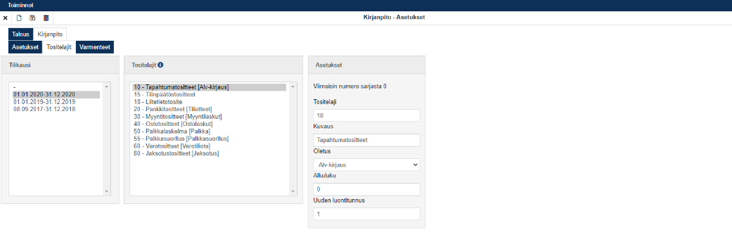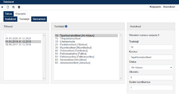 Siirrytään Asetukset > Sovellukset > Talous > Kirjanpito > Tositelajit-välilehti