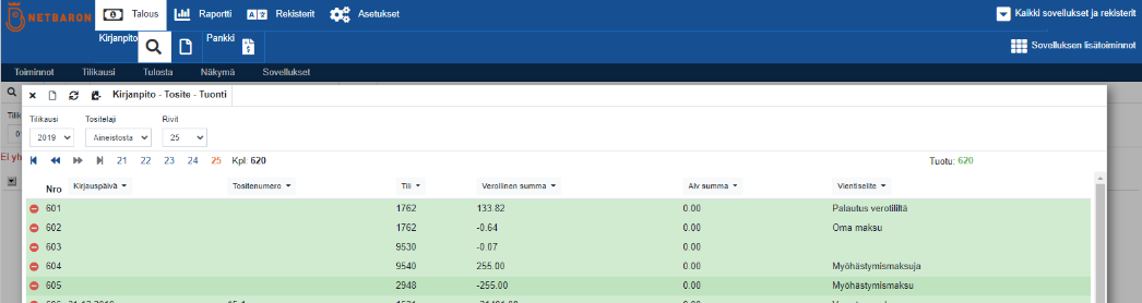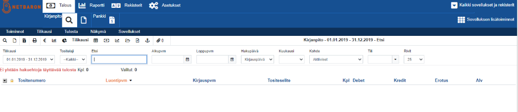 Siirrytään kirjanpidon Etsi-näkymään (Talous > Kirjanpito)