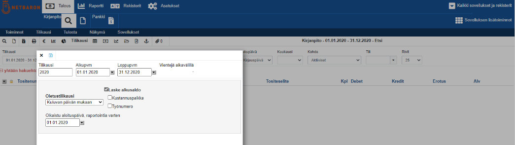 Alkusaldot siirretään kuluvalle tilikaudelle Netbaronissa.