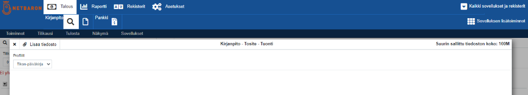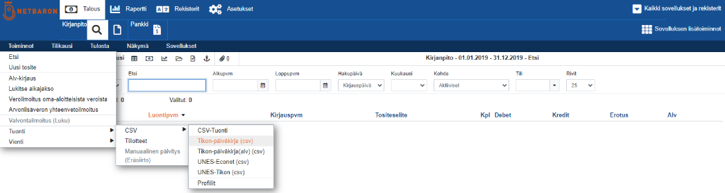 Tehdään tuonti valitsemalla Toiminnot > Tuonti > CSV > Tikon-päiväkirja (csv).