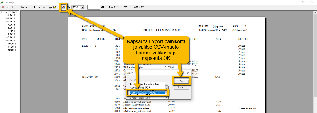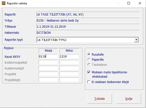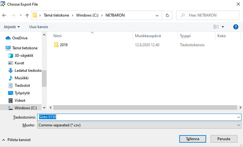 Tällä ohjeella siirrettään Tikonista Netbaroniin edellisen tilikauden vertailutiedot (ohjeessa tilikausi 1.1. - 31-12-2019).