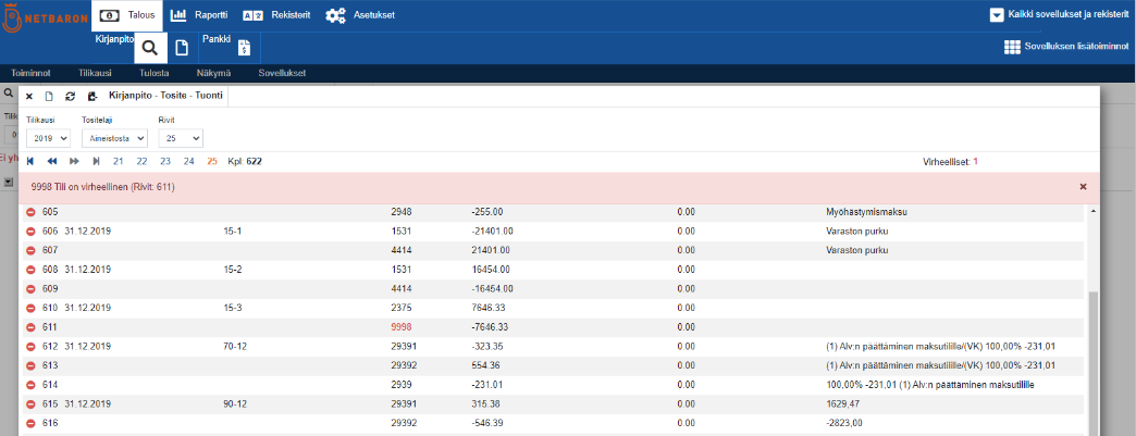 Esimerkissä virheilmoitus viittaa riviin 611, joten siirrytään viimeisellä sivulle, jossa tili on punaisella.