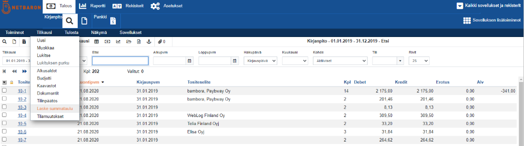 Seuraavaksi tulee päivittää summataulu valitsemalla kirjanpidon Etsi-näkymässä Tilikausi > Laske summataulu.