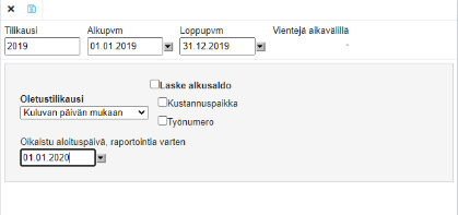 Kirjanpidon Etsi-näkymässä valitaan Tilikausi > Muokkaa ja napsautetaan Tallenna-painiketta, jolloin ohjelma laskee alkusaldot.