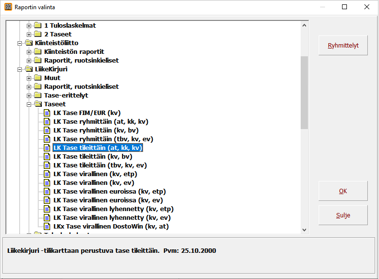 Tase tulostetaan tarkistamista varten. Valitaan LK Tase tileittäin (at, kk, kv):