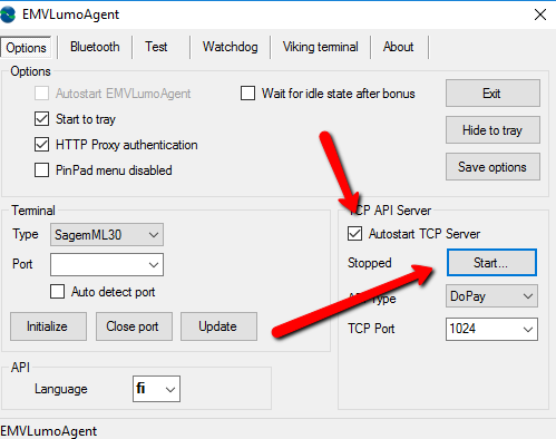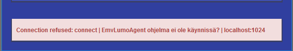 Katso, näkyykö Payment Connector -ikkunassa ilmoitus yhteyden katkeamisesta: Connection refused: connect | EmvLumoAgent ohjelma ei ole käynnissä? | localhost:1024