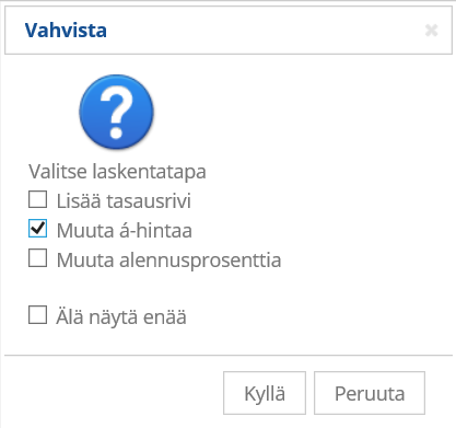 Mikäli valitaan myös Älä näytä enää -kohta aktiiviseksi, ei tätä varmistusikkunaa näytetä toista kertaa tällä laskulla, vaikka Yhteensä-tietoja muutettaisiinkin.