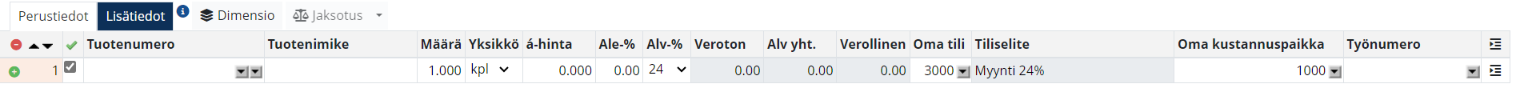 Hinnat voidaan kirjata joko bruttona tai nettona sekä määritellä rivikohtaisesti kustannuspaikat ja tilit.
