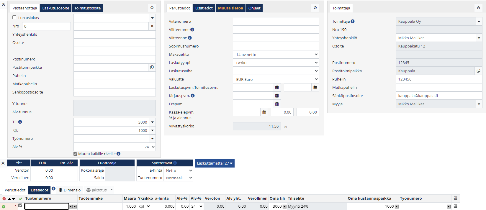 Laskun rivillä olevat tiedot on jaettu kahteen osaan Perustiedot- ja Lisätiedot-välilehdille.