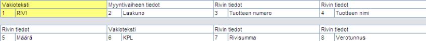 Myyntivaiheen tiedot, Laskuno | Laskunumero | Laskunumero. Tätä tietoa ei saada tiedostosta, vaan sovellusperhe antaa tämän tallennuksen yhteydessä. |
