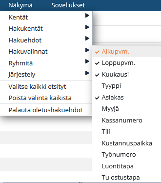 Mikäli on oikeus hakea toimipaikan tai organisaation laskuja, niin on mahdollista käyttää myyjävalintaa hakuehtona valitsemalla Näkymä-valikko > Hakuvalinnat > Myyjä.