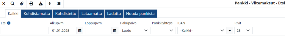 Viitemaksujen Etsi-näkymään pääsee myös suoraan valitsemalla Talous > Myynti > Viitemaksut.