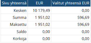 Etsi-näkymän Yhteenveto saadaan näkyviin valikosta Näkymä > Kentät > Yhteenveto. Yhteenvedon -kentissä näkyy sivulla olevien ja valittujen laskujen summa, maksettu, saldo ja korkoja, johon lasketaan korot ja perintäkulut. Kesken rivillä näytetään keskentilassa olevien laskujen summa. Valitut yhteensä summat muuttuvat valittaessa laskuja.