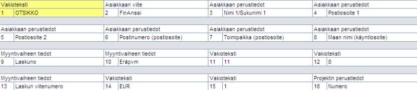 CSV-viennissä on seuraavat kentät, jotka tulevat oletuksena. Kenttiä tarvitaan, jos CSV-tiedostosta muodostetaan esim. suoraveloitusaineisto. Kyseiset kentät on mahdollista jättää pois profiilin luonnin kautta.