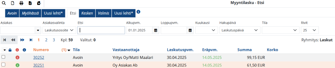 Mikäli laskun vastaanottaja on asiakastyypiltään sellainen, johon käyttäjällä ei ole oikeutta, lasku näkyy laskun ja kassan etsi-näkymässä harmaana. Rivillä ei näy hintatietoja, eikä niitä voi avata kaksoisnapsauttamalla riviä.