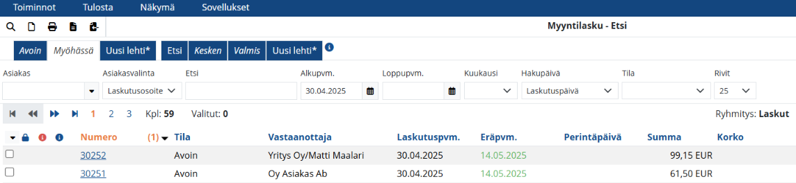 Etsi suoritettavia -painike, jota napsauttamalla näytölle listautuu kaikki erääntyneet / erääntymässä olevat laskut.