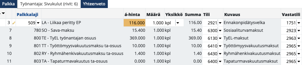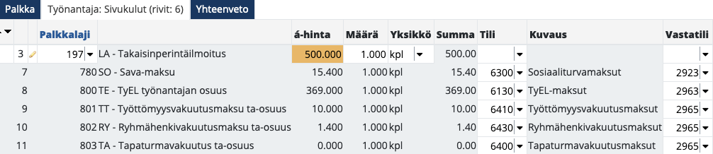 Tallennuksen jälkeen Takaisinperinnän bruttosummarivi siirtyy Työnantaja: Sivukulut -välilehdelle:
