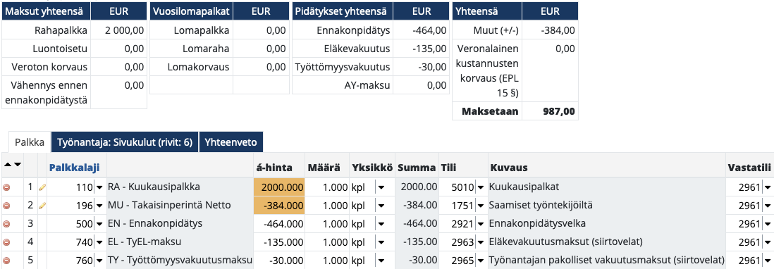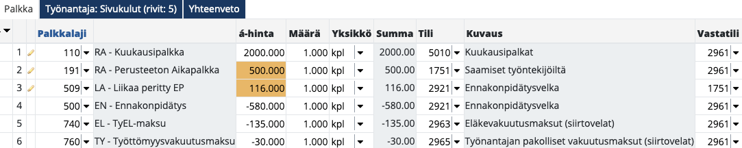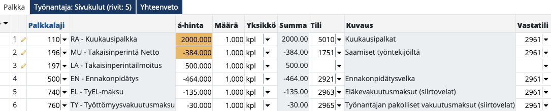 Palkkalaji lisätään Palkkalaskelman Palkkariveille, jolloin takaisinperintärivi pienentää Maksetaan summaa: