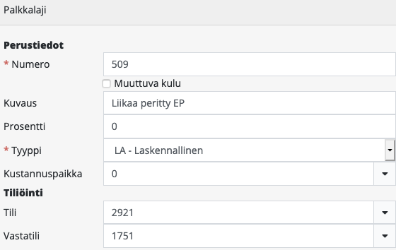 Tässä esimerkissä on perustettu Palkkalaji 509 'Liikaa peritty EP', jolla on Palkkalajityyppinä LA - Laskennallinen: