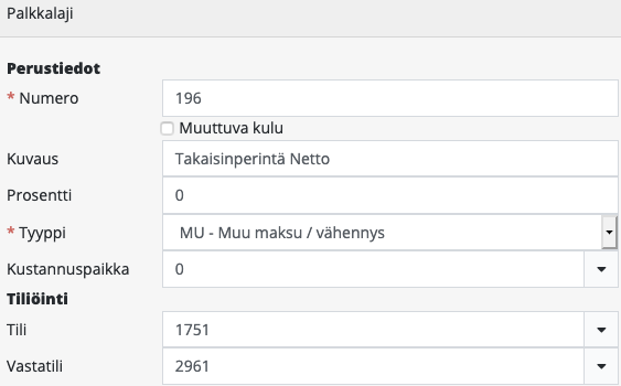 Perustetaan oma Palkkalaji Takaisinperinnälle (jos se puuttuu) Palkkalajityypillä MU - Muu vähennys/maksu.