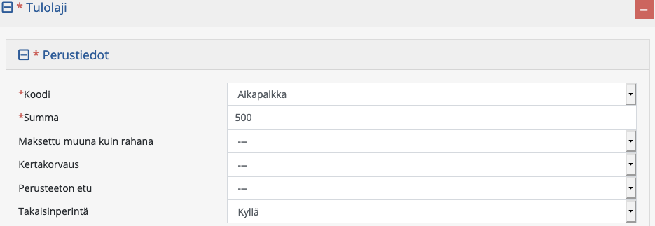 Vaihtoehtoisesti kaikki takaisinperintään liittyvät tiedot täytetään Palkkatietoilmoitukselle manuaalisesti, jolloin erillistä Palkkalajia tätä varten ei perusteta.