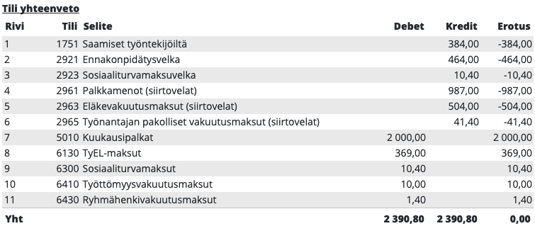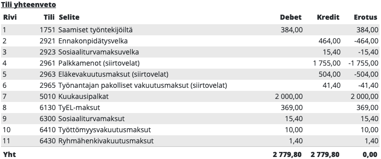 Liikaa pidätetyn ennakonpidätyksen voi kirjata suoraan palkkalaskelmalle, jotta saaminen työntekijältä ja ennakonpidätysvelka näyttävät oikein kirjanpidossa.